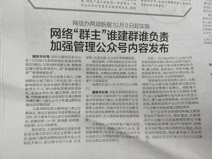 雷鋒網9月7日消息 國家互聯網信息辦公室(以下簡稱“網信辦”)今日發布《互聯網群組信息服務管理規定》(以下簡稱《規定》)。按照文件規定,微信群、QQ群、微博群、貼吧群、陌陌群、支付寶群聊等各類互聯網群組適用于該文件,并依據《互聯網群組信息服務管理規定》第六條“后臺實名、前臺自愿”的原則,對使用者進行真實身份信息認證,以保護使用者個人信息安全。該《規定》將于2017年10月8日正式施行。