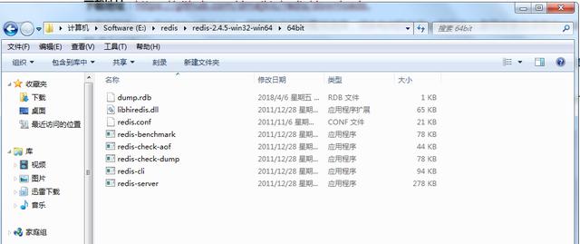 從上述國內下載地址,下載到的是redis-2.4.5-win32-win64版本,即zip包內同時包含32位和64位windows版本的redis程序文件。根據本機的配置情況(64位win7系統),將64bit目錄下相關文件,解壓到如下圖1所示的目錄。