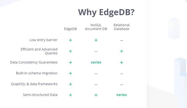 EdgeDB不是傳統的對象數據庫。盡管“object-relational”中有“object”這個詞,但它不是OOP持久性或封裝的實現。它具有表達式查詢語言EdgeQL,其目標是匹配并超越現代SQL功能,如子查詢,高級聚合和窗口函數。