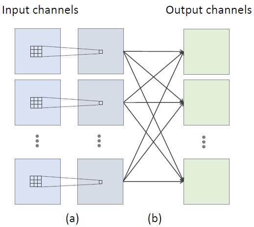 圖 2:3×3 卷積的分解分為兩個步驟。(a) 每個輸入通道的空間域中的獨立 2D 卷積,其中的特征是從 3×3 的臨近區域局部聚合的。(b) 各個通道上逐個元素求和,其中的特征是在所有輸入通道上全局地聚合。