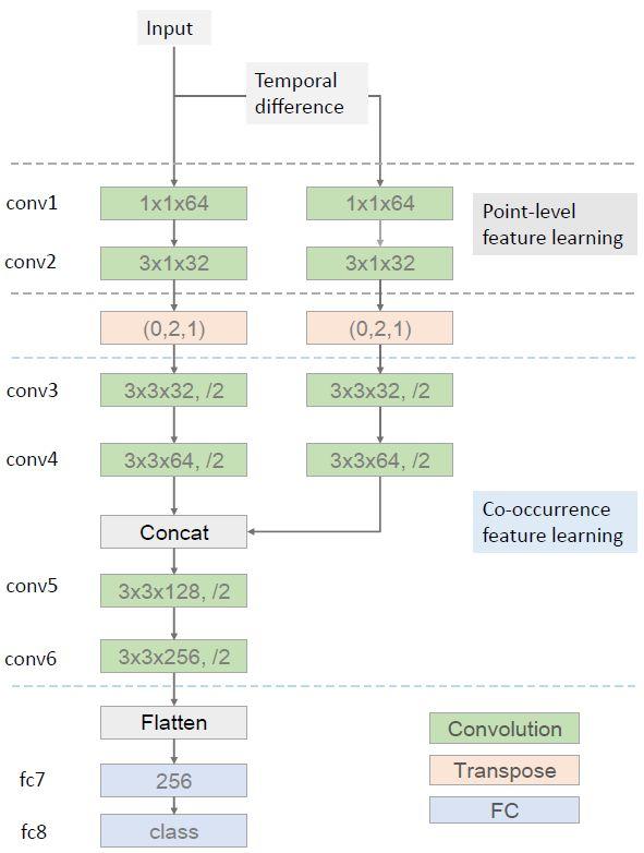我們提出了一種端到端的共現特征學習框架,其使用了 CNN 來自動地從骨架序列中學習分層的共現特征。我們發現一個卷積層的輸出是來自所有輸入通道的全局響應。如果一個骨架的每個關節都被當作是一個通道,那么卷積層就可以輕松地學習所有關節的共現。更具體而言,我們將骨架序列表示成了一個形狀幀×關節×3(最后一維作為通道)的張量。我們首先使用核大小為 n×1 的卷積層獨立地為每個關節學習了點層面的特征。然后我們再將該卷積層的輸出轉置,以將關節的維度作為通道。在這個轉置運算之后,后續的層分層地聚合來自所有關節的全局特征。此外,我們引入了一種雙流式的框架 [Simonyan and Zisserman, 2014] 來明確地融合骨架運動特征。