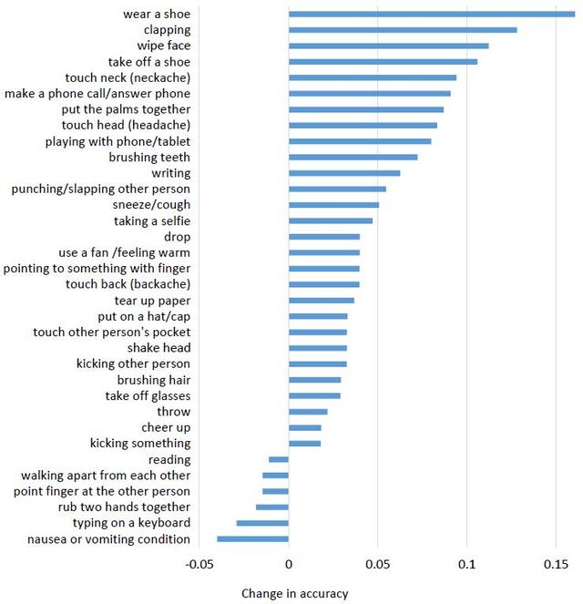圖 6:在 NTU RGB+D 數據集上的 cross-subject 設置中,在每個類別上 HCN 相對于 HCN-local 的準確度變化。為了清楚簡明,這里只給出了變化超過 1% 的類別。