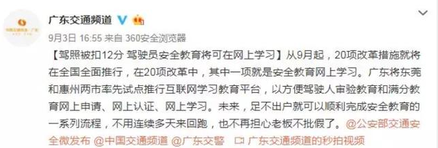 不過現在出來了一項便民的服務,就是從9月起,對于駕照扣滿12分的,無需再跑啦,通過網上就能搞定駕駛人審驗教育、滿分教育網上申請、網上認證以及學習考試。