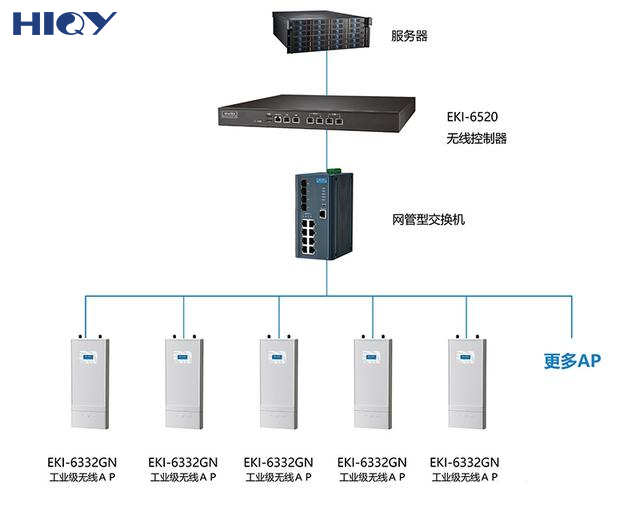 首先針對無線覆蓋設計部分:由于客戶此次需要進行無線環境改造的區域為大型廠房車間,并為金屬結構建筑,與客戶溝通后,我們推薦使用互動EKI-6332工業級無線AP,作為無線環境覆蓋選擇。互動EKI-6332無線AP,擁有工業級設計,針對工業現場能提供較高的防護等級與抗干擾表現。此外,由于客戶要求對所有無線登入客戶進行管控,終端設備必須確保上傳與下載帶寬,漫游與數據回傳時效性等,整體網絡方案中,搭配互動EKI-6520無線控制器,可管理EKI-6332無線AP,提供登入者管控,并且能使AP間的聯機附載均衡,優化整個漫游表現,確??蛻舳说纳蟼髋c下載帶寬,滿足客戶在無線環境改造的需求。