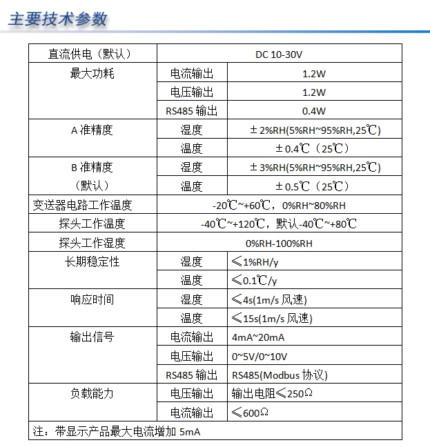 本溫濕度變送器采用外置普通溫濕度傳感器,溫濕度傳感器為方形外殼,方便安裝固定。輸出信號類型分為RS485\4-20mA\0-5V\0-10V等。