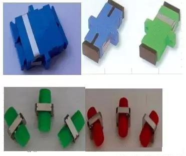 上圖是各種光連接器與之對應的適配器,也稱法蘭盤,用在ODF架上,供光纖連接。