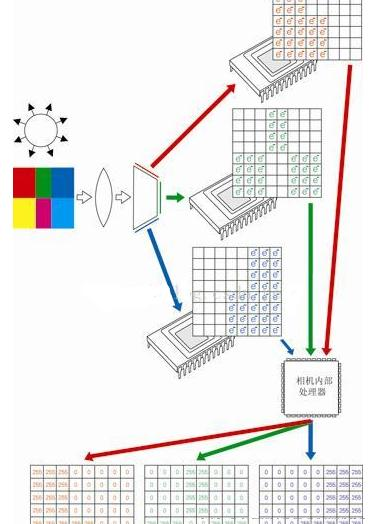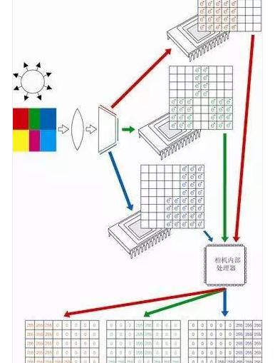 為了獲取光線的顏色信息,可以使用三棱鏡將光束分成單色光,然后分別成像,三棱鏡方式就是這個原理。它從鏡頭射入的光分成三束,每束光都由不同的內置光柵來過濾出某一種三原色,然后使用三塊CCD分別感光。這些圖象再合成出一個高分辨率、色彩精確的圖象。