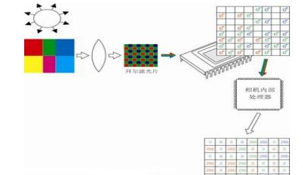 由于每個感光元件對應圖像傳感器中的一個像點,且只能感應光的強度,無法捕獲色彩信息,因此必須在感光元件上方覆蓋彩色濾光片。最常用的做法是覆蓋RGB紅綠藍三色濾光片,以1:2:1的構成由四個像點構成一個彩色像素(即紅藍濾光片分別覆蓋一個像點,剩下的兩個像點都覆蓋綠色濾光片),采取這種比例的主要原因是人眼對綠色較為敏感。