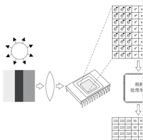 我們首先從相對簡單的黑白數字相機入手。如下圖所示,物體在有光線照射到它表面時將會產生反射,這些反射光線進入鏡頭光圈照射在CCD芯片上,在感應元件產生對應的電荷,電流大小與光強對應。曝光結束后,這些電荷被讀出,并由相機內部的微處理器進行初步處理,存儲到存儲介質當中,此時由該微處理器輸出的就是一幅數字圖像了。