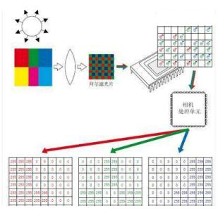 如果在CCD表面覆蓋一個只含紅綠藍三色的馬賽克濾鏡,再加上對其輸出信號的處理算法,就可以實現一個 CCD 輸出彩色圖像數字信號。由于這個設計理念最初由拜爾(Bayer)先生提出,所以這種濾鏡也被稱作拜爾濾鏡。