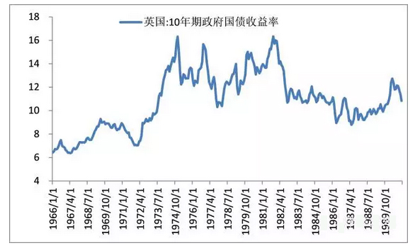 1979年撒切爾夫人上臺后,開始供給側改革,減少國企補貼,消減福利,財政風險下降,控制貨幣供應量,收縮無效融資需求,英國央行的基準利率和資本市場的無風險利率得以穩定的下降,基準利率從1979年的17%下降到1984年3月的8.75%。經濟增速從1982年的-2.2%一路回升至1988年的5.9%,而通脹卻從1980年的18%迅速回落至1986年的3.4%。