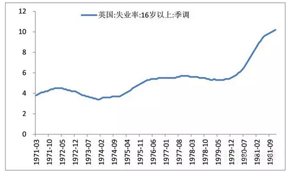 70年代,英國遭遇了長達10年的高失業率與高通脹共存的“滯脹”現象。外部因素如石油危機引起的油價飛漲,固然是英國高通脹的重要原因之一,但其內部因素更加重要。面對經濟低迷,英國政府采取凱恩斯的需求刺激政策,財政和貨幣政策雙寬松,變相債務貨幣化,致使通脹不斷攀升。另外,英國工會濫用勞資談判的權力,過度追求工資增長,導致英國工資水平與通貨膨脹間的螺旋式上漲。1974-1980年間,英國GDP增長率平均只有1.0%,而通貨膨脹率平均達到15.9%。同時,英國的失業率卻不斷攀升,從70年代初的3.8%上升至70年代末的5.5%,80年代初更是攀升至11.9%,致使經濟深陷滯脹泥潭。