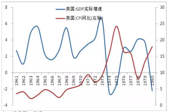 1973年第一次石油危機爆發,布雷頓森林體系瓦解,全球經濟陷入衰退,導致英國低增長、高失業、高通脹、國際收支惡化等經濟矛盾激化。面對危機,英國工黨政府依然采取凱恩斯主義的宏觀調控政策,試圖通過逆周期的財政和貨幣政策刺激需求來降低失業率,推動經濟復蘇。但是英國經濟面臨的是供給側的結構性問題,需求側的刺激不但沒有改善經濟,反而造成英國長期持續的經濟滯漲。