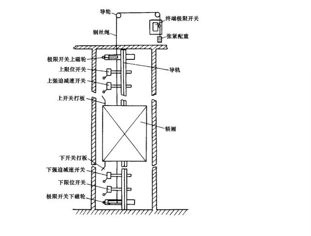 在井道內不要安裝各種控制開關,并敷設相應線路,這些開關有層門鎖開門,當樓層門未閉鎖時開關斷開電梯不能啟動;平層開關,為了電梯到樓層能準確停止,各導層都設有磁控平層開關;上下限位開關,為了防止電梯運行超出上下極限位置,發生沖頂或沖底事故,在井道上下端設若干限位開關,如圖所示。