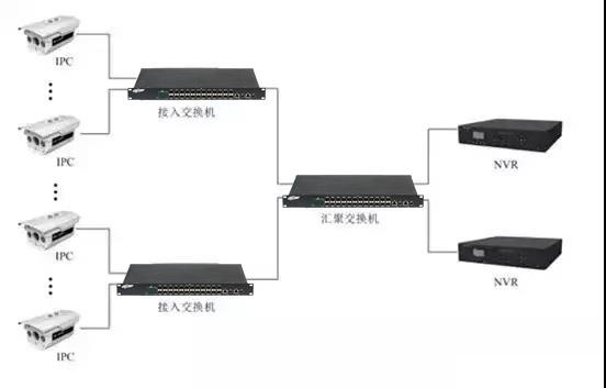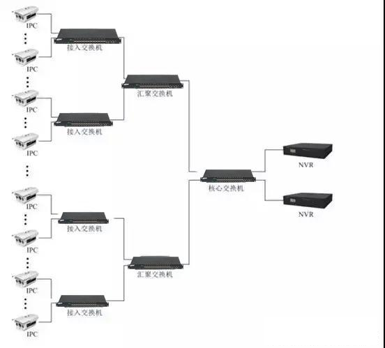 針對50個點以上的中大型工程,需要采用三層網絡架構:接入層、匯聚層、核心層。