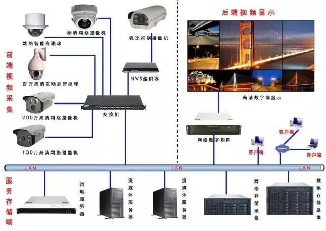 網絡監控系統是由很多不同的設備組成,主要包括攝像頭、錄像機NVR(或普通pc機加客戶端)、交換機(需根據攝像頭數量和碼率進行調節)、硬盤、顯示器、網線、電源護套線、電源配適器(或12V直流開關電源)、攝像頭支架等。
