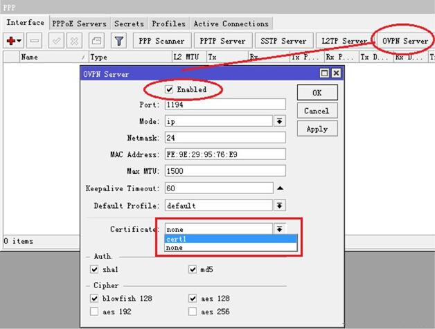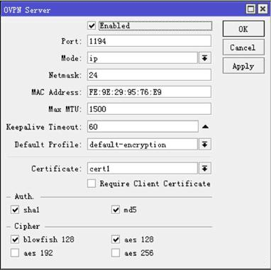 剩下的步驟就是啟用 OVPN服務,選擇 enable啟用 OVPN服務,并選擇 certificate為 cer1,其他參數默認配置,當然端口你可以自己選擇,這里默認是 1194