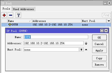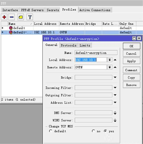 進入 ppp profile設置規則 local-address=192.168.10.1和 remote-address=OVPN