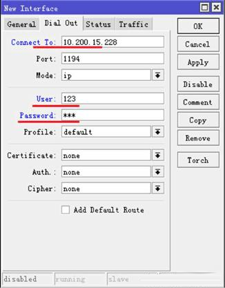 打開后,選擇 Dial-out,設置 Connect-to=10.200.15.228,user=123,password=123,其他參數默認
