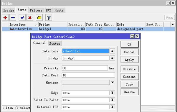 在 OVPN Client端同樣配置橋接,進入 bridge后添加一個橋取名為bridge1,并在 port里將內網網卡ether2-lan和,ovpn-out1接口手動添加到 bridge1里,如下圖