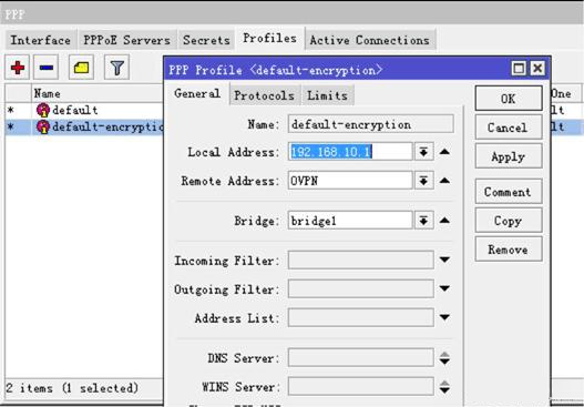 回到 ppp profile里設置 default-encryption的 bridge選項設置為剛才我們添加的 bridge1