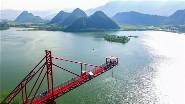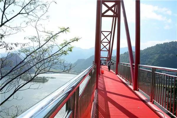 踏上懸在空中68米高,伸出湖面懸空跨度99米的觀景平臺,看著腳下波光粼粼的湖水,仿佛觸手可摸的朵朵白云。此景只應寶晶有,從此人間不復求。紅色的觀景臺采用縷空鋼架結構,如同彩虹一樣橫跨在湖面。小伙伴們會發現,在這個觀景平臺上,所有玻璃橋都弱爆了。