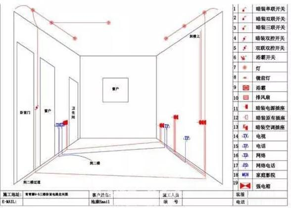 室內線路主要由明敷布線、暗敷布線和明暗混合布線三大類, 明敷布線——即指室內沒有裝飾頂棚板,線路沿墻和樓層頂表面敷設,或室內有裝飾頂棚板,而線路沿墻身和頂棚板外表面敷設,能直接看到線路走向的敷設方法,稱明敷布線。