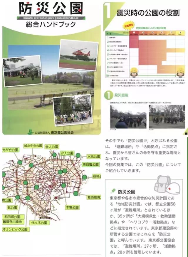 日本東京公園協會目前管理著90多處防災公園。為了向社會各界宣傳防災公園的作用和利用方法,專門編寫了一本“防災公園綜合手冊”。