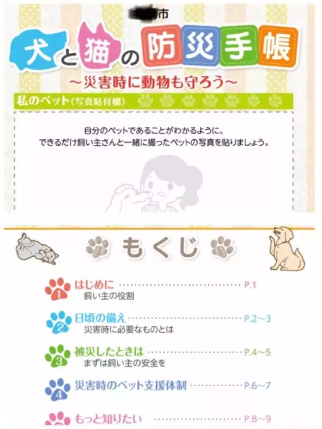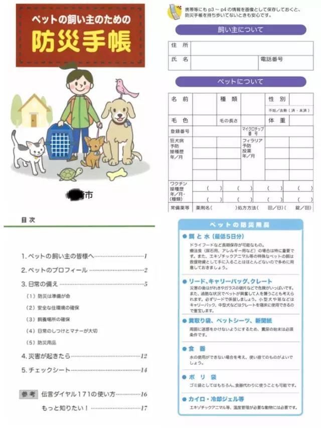 在日本,一些地方政府免費向市民發放有保護寵物的內容的防災手冊。其中,不僅編寫了日常的防災措施,還編寫了災后對寵物的救助方法等知識。參見以下圖片,作為舉例,僅供參考。