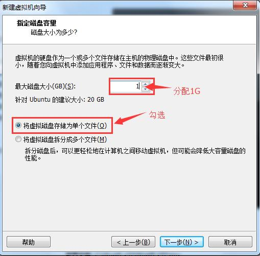 分配磁盤容量 1G ,勾選:將虛擬磁盤存儲為單個文件(O),點擊下一步