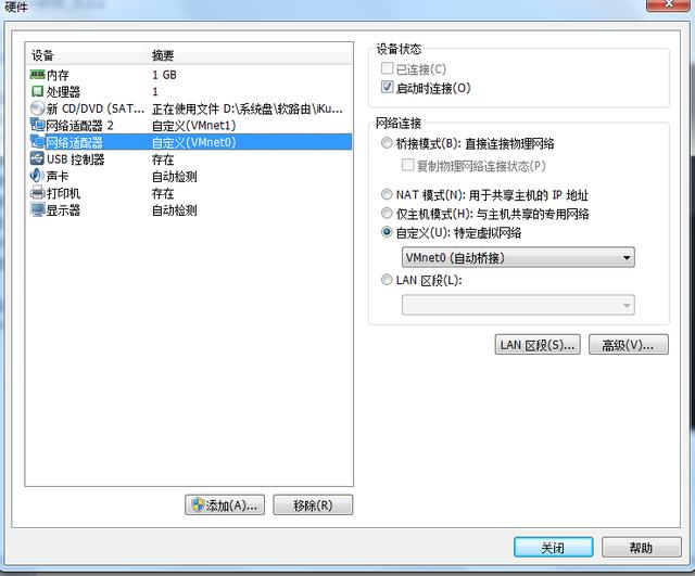 再設置一下:網絡適配器 自定義:特定虛擬網絡 選擇VMnet0(自動橋接) 點擊關閉
