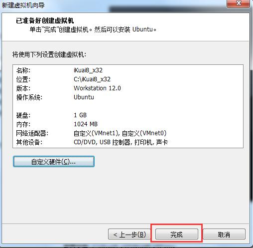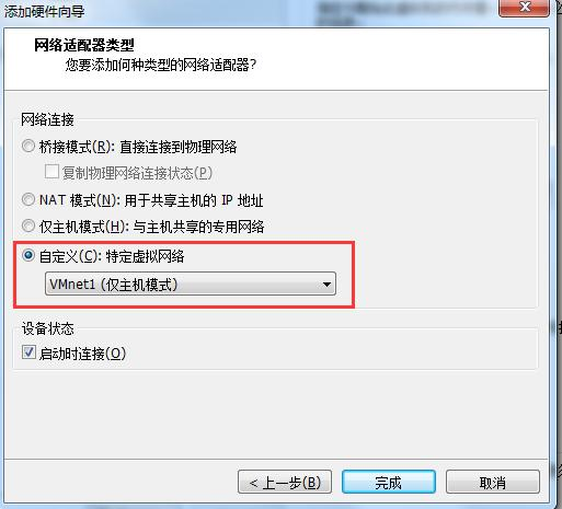 自定義:特定虛擬網絡 選擇VMnet1(僅主機模式) 點擊完成