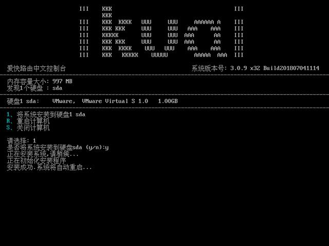第三步:安裝愛快ikuai固件,請選擇:1 是否安裝系統選擇 y 然后按 回車。