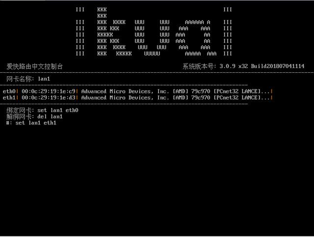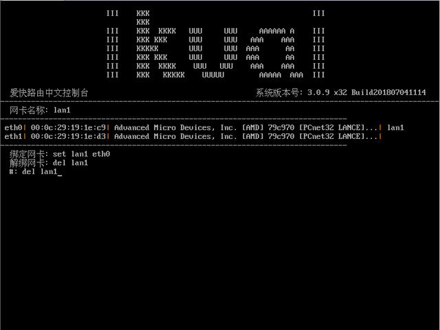 請輸入菜單編號:1 然后回車,出現如下圖:再輸入命令:del lan1 回車解綁網卡。