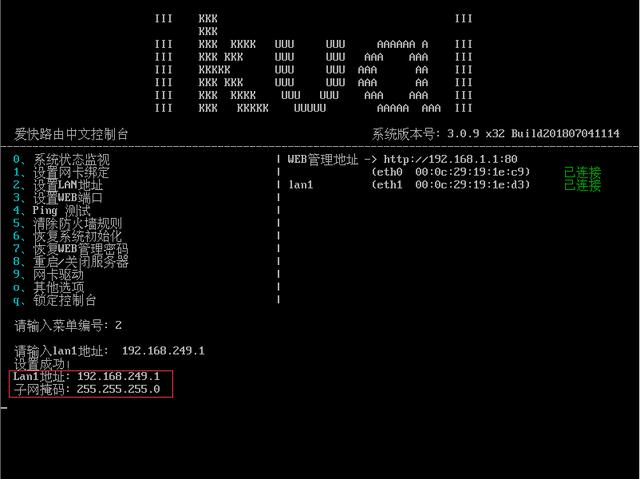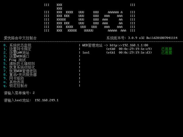 請輸入菜單編號:2 按下回車,出現:請輸入lan1地址:192.168.249.1 回車設置完成\
