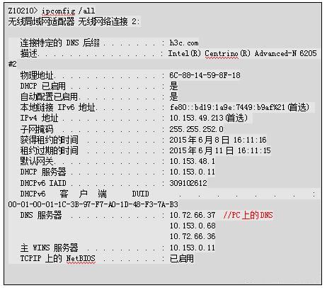 例如:在PC上通過ipconfig /all查看PC上的IP和DNS配置情況。