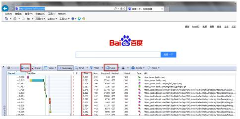 然后在瀏覽器中輸入需要測試的網址,比如此處采用www.baidu.com,待網頁完全打開之后,點擊“stop”,并將記錄的信息保存為hwl文件。由于目前的網站都是采用分布式的,網頁資源并非集中到某一個域名下,一般都會放置到不同的服務器中,比如百度的首頁內容,就涉及到了多個域名,通過記錄,可以查看到哪個網頁元素導致網頁打開慢。