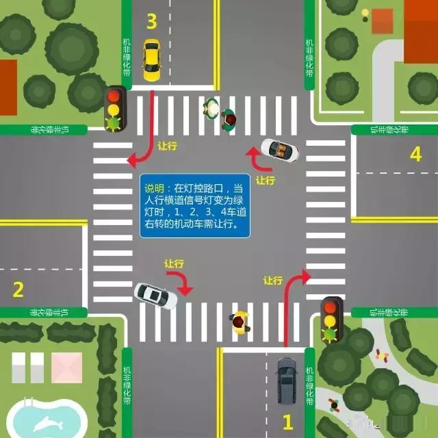 圖為路口右轉讓行。當人行橫道信號燈變為綠燈時,1、2、3、4車道右轉的機動車都需讓行。