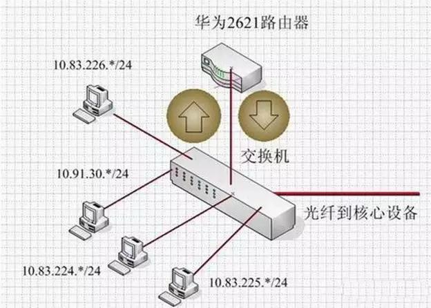 交換機連接了多個網段,有10.91.30.*/24,10.83.224.*/24,10.83.225.*/24,10.83.226.*/24。每個網段都處在不同的VLAN中。所有數據包都通過光纖連接到核心設備。由于交換機上的光纖接口只對于10.91.30.*/24有效,所以其他網段的計算機在沒有路由器的前提下都無法正常上網。這時我們就需要通過華為2621路由器為他們指明路由下一跳的地址,完成數據包的傳輸。