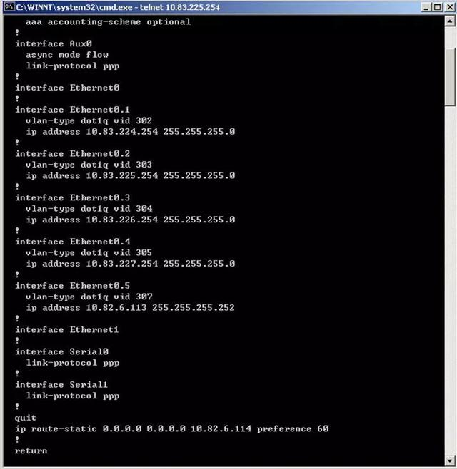 交換機上劃分VLAN以及將不同接口和網段加入不同VLAN的操作這里就不詳細說明了。實際情況中10.83.224.*對應VLAN302,10.83.225.*對應VLAN303,10.83.226.*對應VLAN304,10.83.227.*對應VLAN305。下一條的路由地址為10.82.6.113,對應的VLAN號是307。