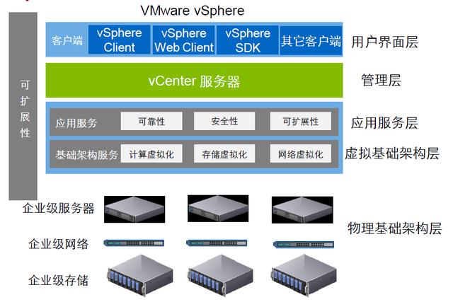 虛擬化服務器:又稱x86服務器,可以由多個ESXi組成,通過網絡服務提供CPU和內存資源,所有的虛擬機運行在該服務器中。存儲網絡:用于存儲所有的虛擬化數據,虛擬機的性能也與之息息相關。存儲網絡可以使用SAN、NAS等存儲技術。