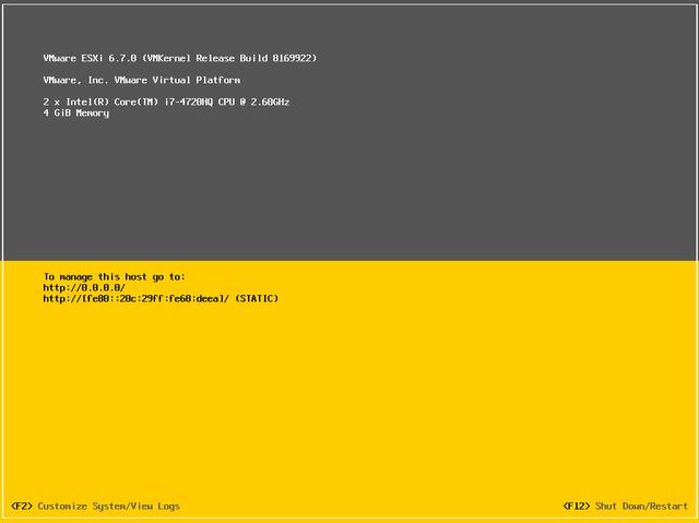 重啟之后,剛才祼機硬盤中的已經有了ESXi系統,ESXi服務器全文本界面,因為真實的環境下我們平?;竞苌傩枰谶@臺服務器上進行操作,有關的操作如創建管理虛擬服務器等,都可以在瀏覽器/vSphereClient上進行(6.5之后官方開始推薦直接瀏覽器界面配置了); 不過在此之前,我們需要對ESXi的網絡進行一些配置,vSphere Client對其的控制也是通過網絡進行的,我們必須事先為ESXi配置好訪問IP。9、重啟完成后進入該界面,按下F2鍵彈出登陸界面