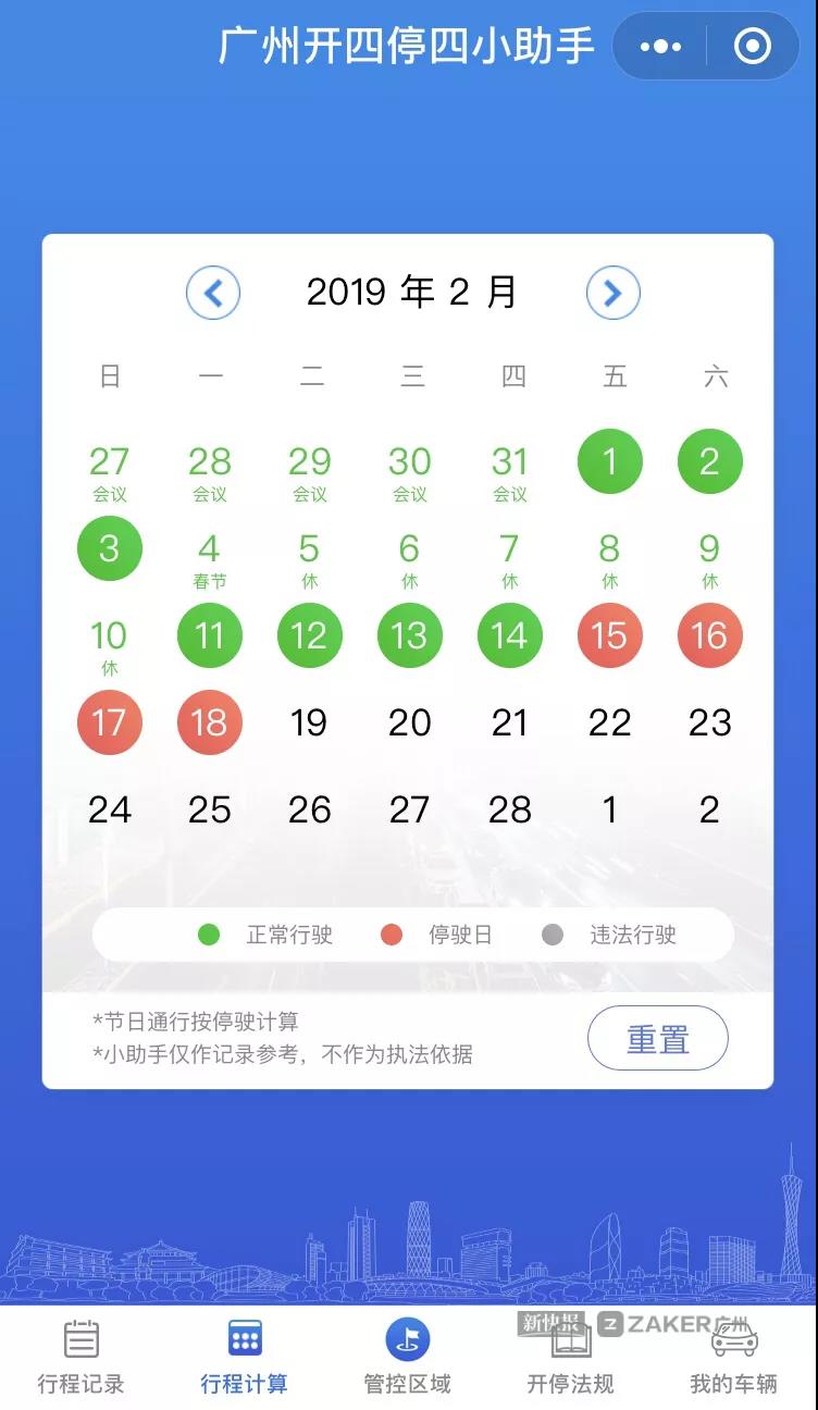 在 " 開四停四小助手 " 日歷頁面,從 1 月 25 日開始,記者將該天標記為行駛日,直至 2 月 14 日均為可行駛日,這意味著外地車連續 21 天在廣州不受 " 限行 "。