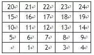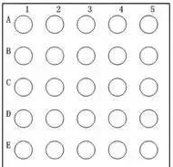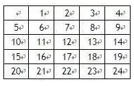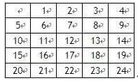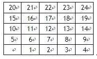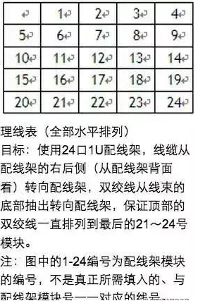 理線表是一張人為定義的表格,當使用24口配線架2可以使用5×5理線板,該理線表為5行5列的表格,每個單元格對應一個孔。理線表的填寫方法可以有多種,每種填寫方法對應于一種排列順序。在下圖中介紹了其中一種排列順序(孔內數字代表配線架上的模塊編號),它的特點是在配線架背后的每根線全部水平平行排列。