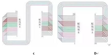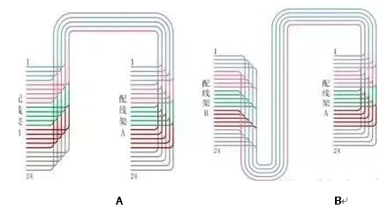 根據圖示,在A配線架上雙絞線的排列為1號線最先出現,其他線按順序出線,排列整齊;在B配線架上為24號線先出線,改為了下出線方式,由于最上層的線全部覆蓋在所有的線上,保持了一層完全平整的斜線,所以在B配線架上依舊美觀。