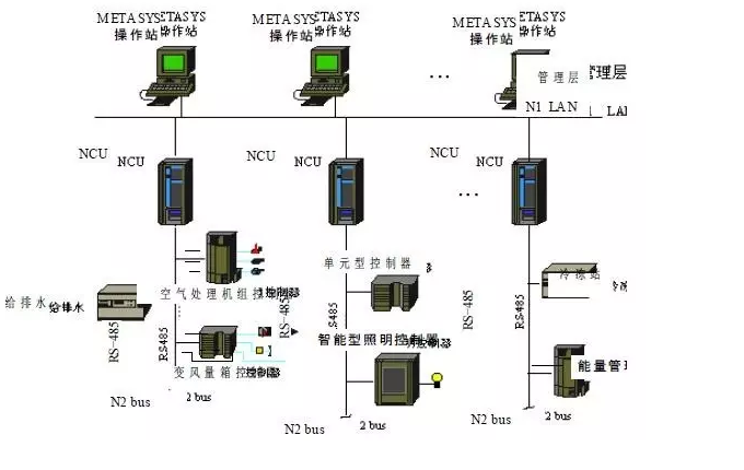 METASYS操作站METASYS操作站METASYS操作站管理層N1 LANNCUNCUNCU給排水RS-485RS-485RS-485…變風量箱控制器N2 busN2 busN2 bus單元型控制器智能型照明控制器……冷凍站能量管理空氣處理機組控制器。