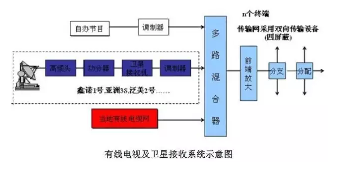 有線電視系統主要由信號源、前端、干線傳輸和用戶分配網絡組成。信號源接收設備向前端提供系統欲傳輸的各種信號。它一般包括開路電視接收信號、調頻廣播、地面衛星、微波以及有線電視臺自辦節目等信號。系統的前端部分的主要任務是將信號源送來的各種信號進行濾波、變頻、放大、調制、混合等,使其適用于在干線傳輸系統中進行傳輸。系統的干線傳輸部分將系統前端部分所提供的電視信號通過傳輸媒體不失真地傳輸給分配系統。其傳輸方式主要有光纖、微波和同軸電纜三種。