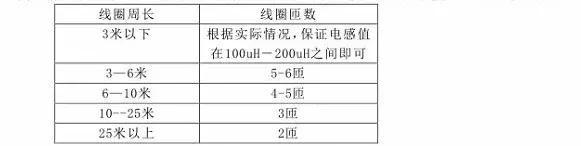 為了使檢測器工作在最佳狀態下,線圈的電感量應保持在100uH-300uH之間。在線圈電感不變的情況下,線圈的匝數與周長有著重要關系。周長越小,匝數就越多。一般可參照下表: