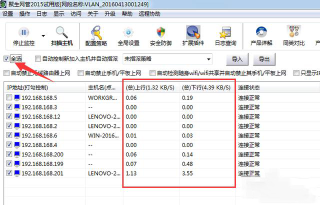 “聚生網管”一款老牌的局域網管理工具,以前我經常推薦給朋友使用,尤其是在群租房里大家共用寬帶的時候,總是有些人全天24小時P2P下載占用帶寬,我就用這款軟件來解決這種問題。下載安裝完成之后選擇使用的網卡開始監控: