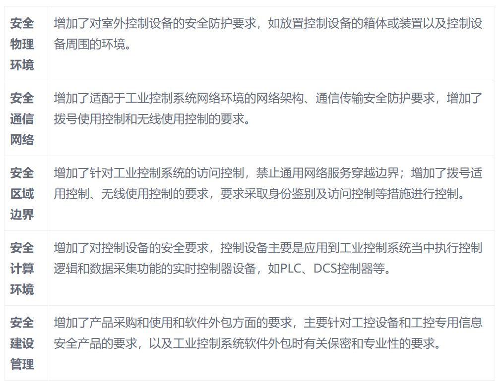 除了安全通用要求,針對工業控制系統專門擴充了安全擴展要求內容,首次明確了區別于傳統網絡的工業控制系統在特殊的應用場景下,如何對等級保護建設提出要求。